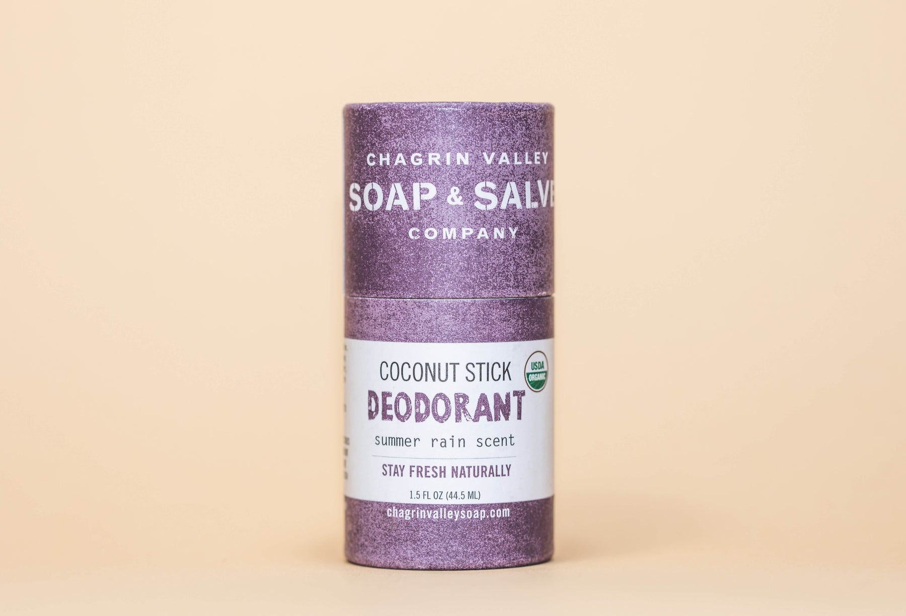 An organic Coconut Zero Waste Deodorant Stick (2.1 Oz - 62 grams) that readily absorbs into your skin to help you stay fresh naturally with a refreshing, Natural Scent, Summer Rain, Lemongrass & Tea Tree or Citrus Mint for men and women too!