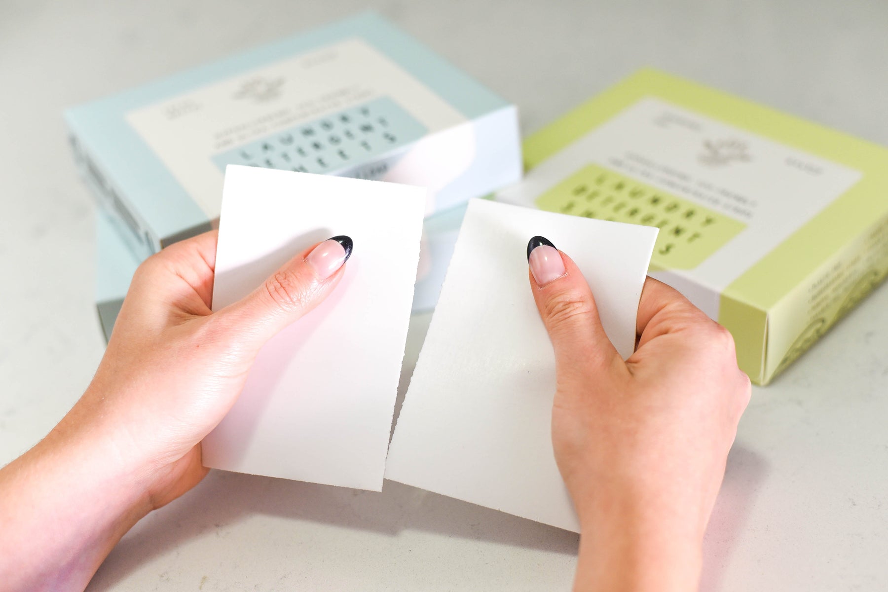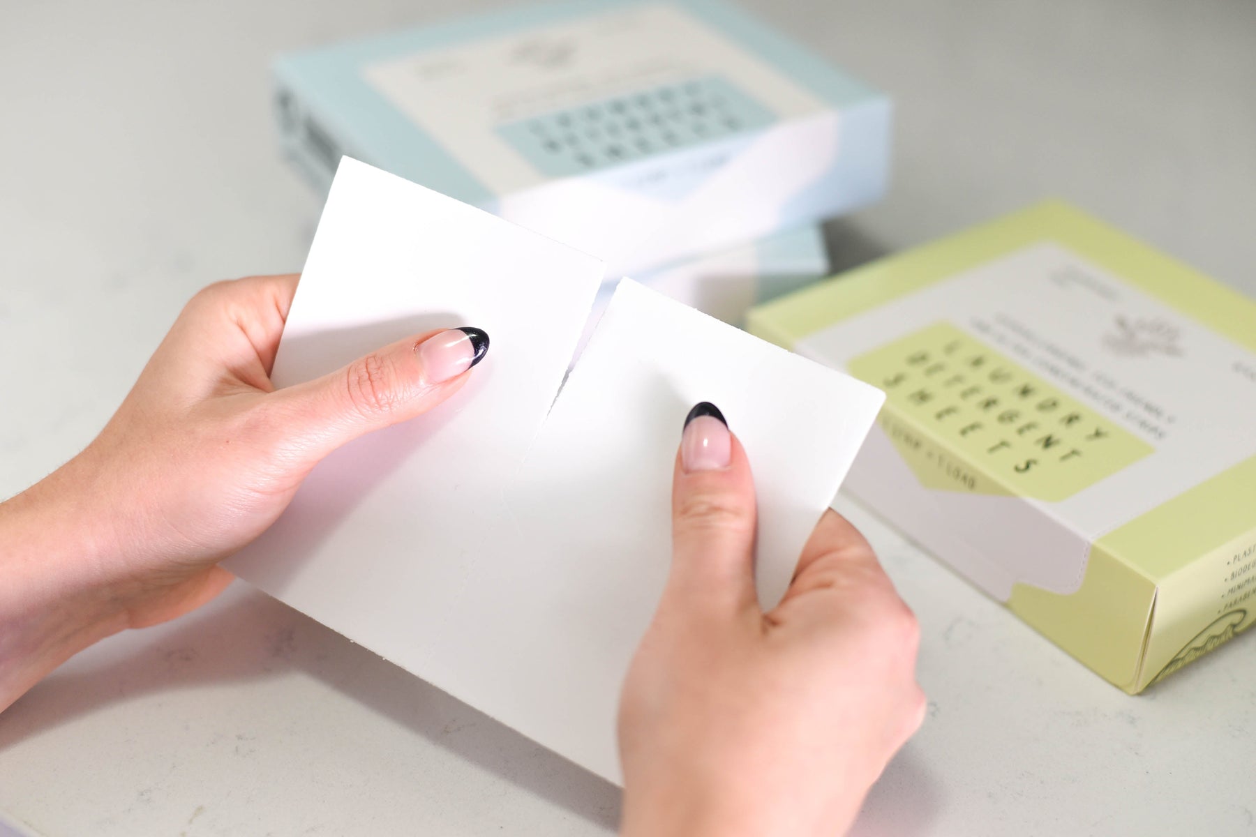 Our eco-friendly laundry detergent strips are packaged in a plastic-free compostable cardboard package.