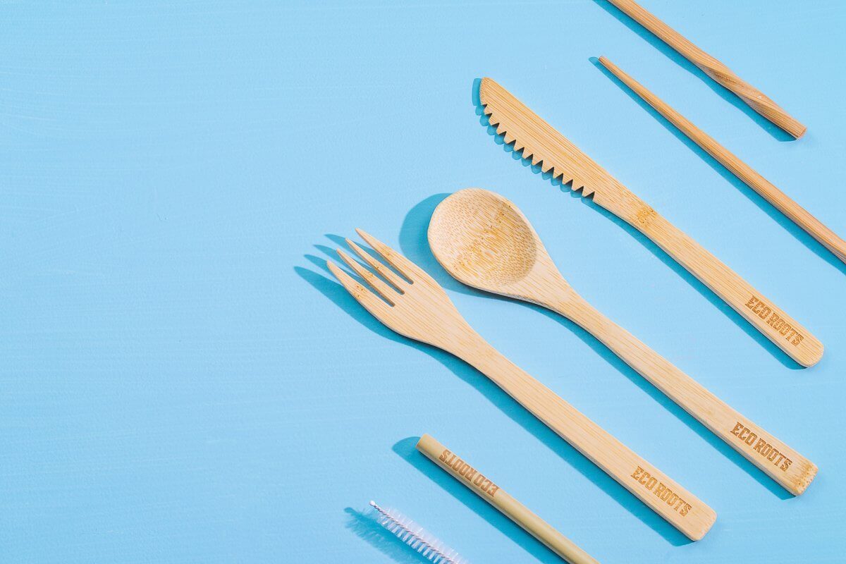 This Bamboo Cutlery Set includes a knife, a fork, a spoon, a pair of chopsticks, and a bamboo straw.