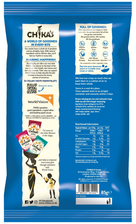 CHIKA’s wholesome Rice Crisp snacks are made with wholegrain brown rice, red lentils and natural flavourings. That’s it! Nothing else! Nada! No potato, no flours or powders, just locked in IYANU goodness sure to make you very popular indeed!